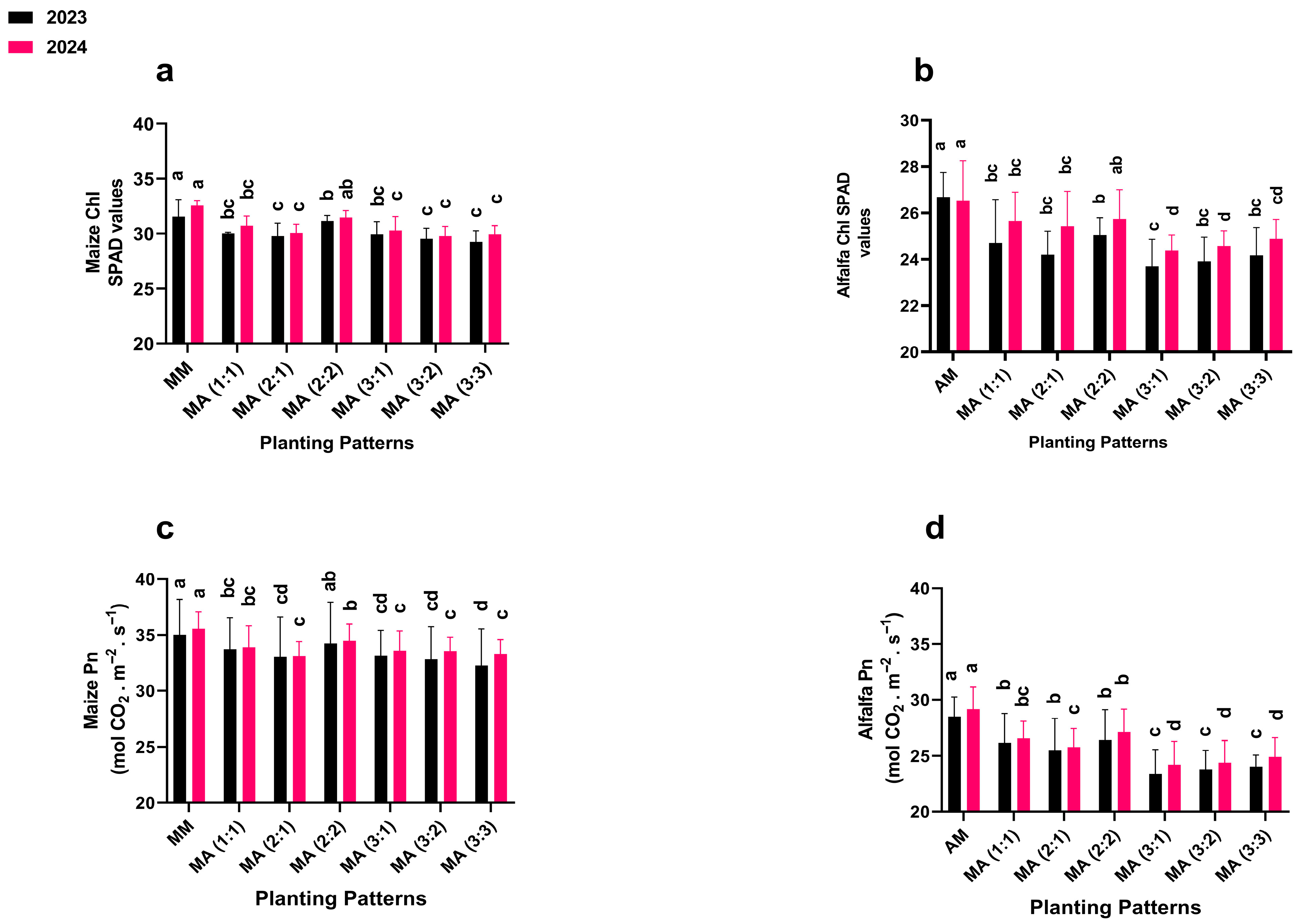 - Nasar, J.; Khan, W.; Khan, M.Z.; Gitari, H.I.; Gbolayori, J.F.; Moussa, A.A.; Mandozai, A.; Rizwan, N.; Anwari, G.; Maroof, S.M. Photosynthetic Activities and Photosynthetic Nitrogen Use Efficiency of Maize Crop Under Different Planting Patterns and Nitrogen Fertilization. J. Soil Sci. Plant Nutr. 2021, 21, 2274–2284. [Google Scholar] [CrossRef]