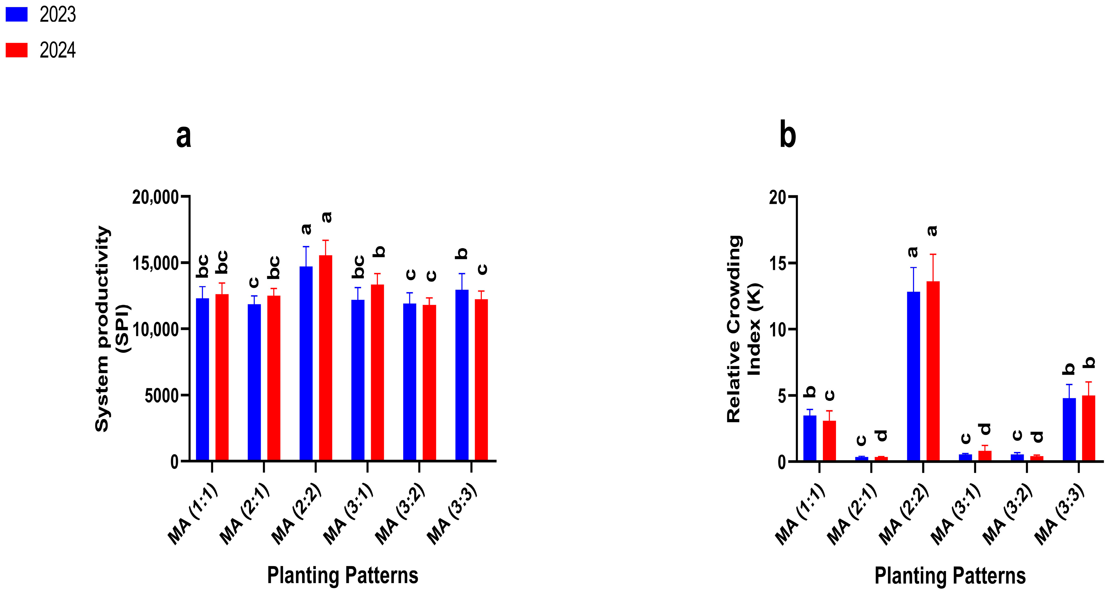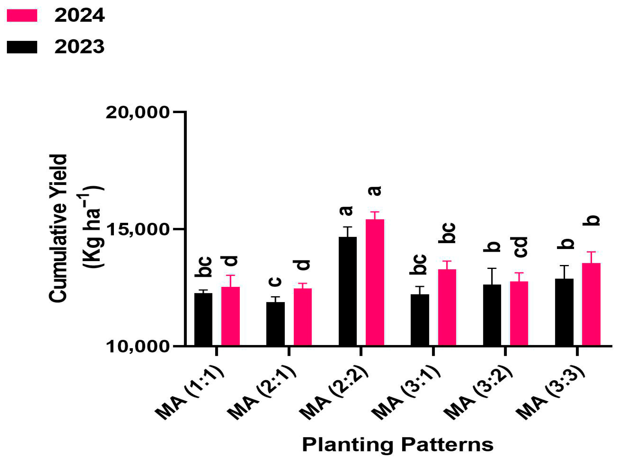 | Planting Patterns | Forage Yield (Kg ha−1) | Biomass Dry Matter (Kg ha−1) | ||