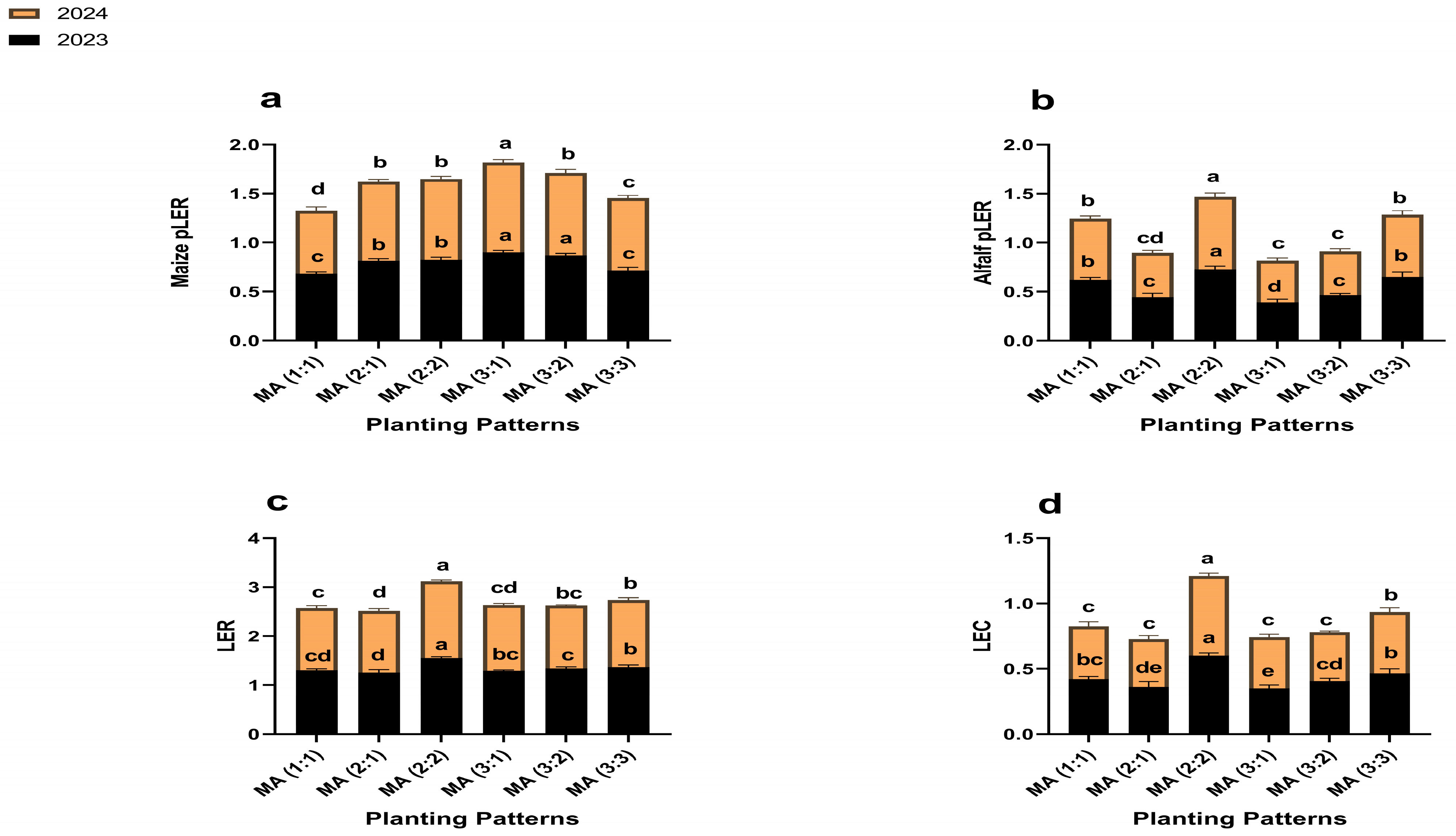 4.3. Resource Use Efficiency Indices of Maize-Alfalfa Intercropping
