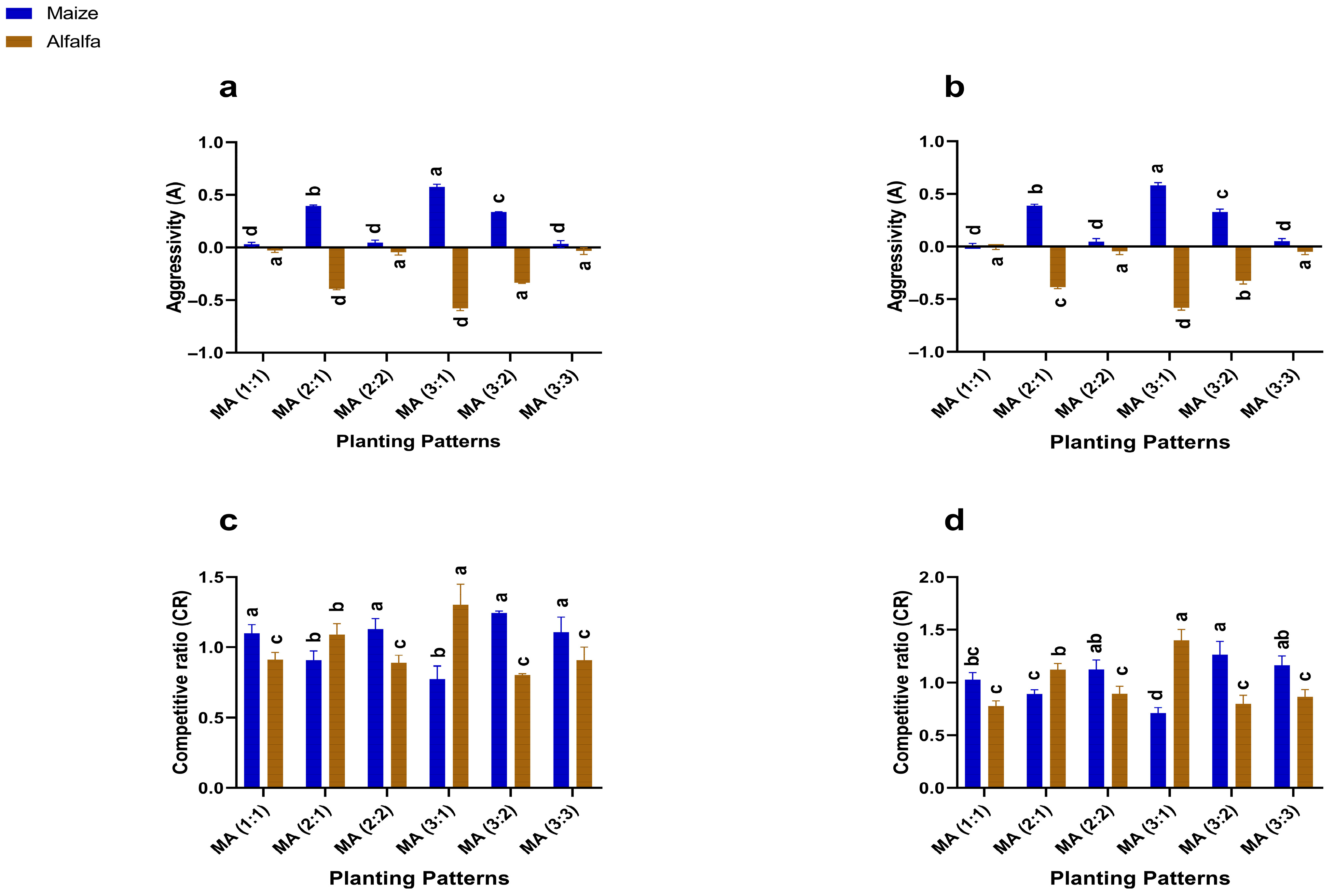 4.4. Productive and Advantageous Indices of Maize-Alfalfa Intercropping