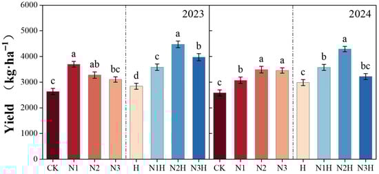 The impact of different fertilization treatments on yield from 2023 to 2024. CK (0 kg ha−1 nitrogen fertilizer); N1 (120 kg ha−1 nitrogen fertilizer); N2 (150 kg ha−1 nitrogen fertilizer); N3 (180 kg ha−1 nitrogen fertilizer); H (1500 kg ha−1 humic acid); N1H (120 kg ha−1 nitrogen fertilizer and 1500 kg ha−1 humic acid); N2H (150 kg ha−1 nitrogen fertilizer and 1500 kg ha−1 humic acid); and N3H (180 kg ha−1 nitrogen fertilizer and 1500 kg ha−1 humic acid). Different letters on the bar chart denote statistically significant differences (p < 0.05) identified by Duncan’s multiple range test.