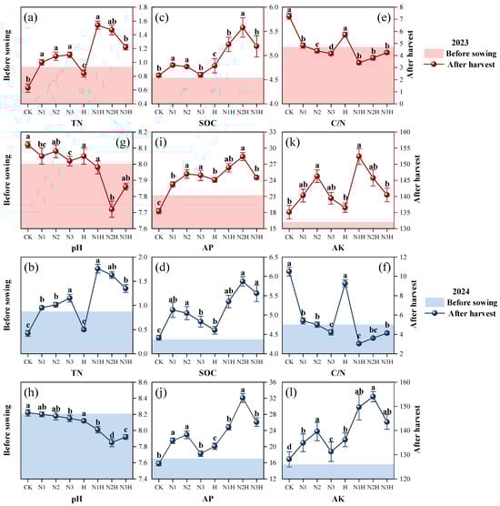 The effects of different fertilization treatments on soil total nitrogen (TN), soil organic carbon (SOC), carbon-to-nitrogen ratio (C/N), pH, available phosphorus (AP), and available potassium (AK) from 2023 to 2024 were evaluated. CK (0 kg ha−1 nitrogen fertilizer), N1 (120 kg ha−1 nitrogen fertilizer), N2 (150 kg ha−1 nitrogen fertilizer), N3 (180 kg ha−1 nitrogen fertilizer), H (1500 kg ha−1 humic acid), N1H (120 kg ha−1 nitrogen fertilizer and 1500 kg ha−1 humic acid), N2H (150 kg ha−1 nitrogen fertilizer and 1500 kg ha−1 humic acid), and, N3H (180 kg ha−1 nitrogen fertilizer and 1500 kg ha−1 humic acid). (a) 2023 TN; (b) 2024 TN; (c) 2023 SOC; (d) 2024 SOC; (e) 2023 C/N; (f) 2024 C/N; (g) 2023 pH; (h) 2024 pH; (i) 2023 AP; (j) 2024 AP; (k) 2023 AK; (l) 2024 AK; Different letters on the bar chart denote statistically significant differences (p < 0.05) identified by Duncan’s multiple range test.