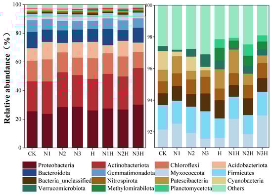 Soil bacterial community phylum levels under different fertilization treatments. CK (0 kg ha−1 nitrogen fertilizer); N1 (120 kg ha−1 nitrogen fertilizer); N2 (150 kg ha−1 nitrogen fertilizer); N3 (180 kg ha−1 nitrogen fertilizer); H (1500 kg ha−1 humic acid); N1H (120 kg ha−1 nitrogen fertilizer and 1500 kg ha−1 humic acid); N2H (150 kg ha−1 nitrogen fertilizer and 1500 kg ha−1 humic acid); and N3H (180 kg ha−1 nitrogen fertilizer and 1500 kg ha−1 humic acid). The enlarged area is indicated by the red box on the right-hand side of the image.