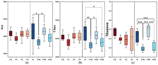 Alpha diversity analysis of bacterial communities under different fertilization treatments. CK (0 kg ha−1 nitrogen fertilizer); N1 (120 kg ha−1 nitrogen fertilizer); N2 (150 kg ha−1 nitrogen fertilizer); N3 (180 kg ha−1 nitrogen fertilizer); H (1500 kg ha−1 humic acid); N1H (120 kg ha−1 nitrogen fertilizer and 1500 kg ha−1 humic acid); N2H (150 kg ha−1 nitrogen fertilizer and 1500 kg ha−1 humic acid); and N3H (180 kg ha−1 nitrogen fertilizer and 1500 kg ha−1 humic acid). * indicate significance at the 0.05 level, ** indicate significance at the 0.01 level, and *** indicates extreme significance at the 0.001 significance level. (a) Ace Index; (b) Chao Index; (c) Shannon Index.
