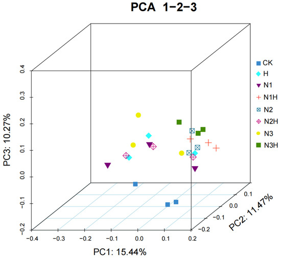 Soil bacteria (OUT level) community PCoA analysis. CK (0 kg ha−1 nitrogen fertilizer); N1 (120 kg ha−1 nitrogen fertilizer); N2 (150 kg ha−1 nitrogen fertilizer); N3 (180 kg ha−1 nitrogen fertilizer); H (1500 kg ha−1 humic acid); N1H (120 kg ha−1 nitrogen fertilizer and 1500 kg ha−1 humic acid); N2H (150 kg ha−1 nitrogen fertilizer and 1500 kg ha−1 humic acid); and N3H (180 kg ha−1 nitrogen fertilizer and 1500 kg ha−1 humic acid).