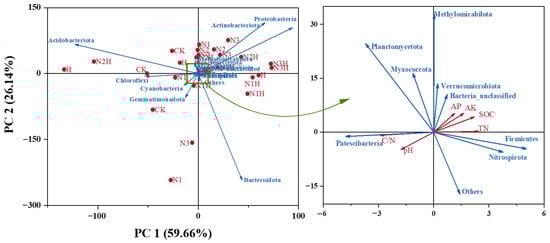 Redundancy Analysis of Soil Physical and Chemical Indicators and Soil Bacterial Communities. CK (0 kg ha−1 nitrogen fertilizer); N1 (120 kg ha−1 nitrogen fertilizer); N2 (150 kg ha−1 nitrogen fertilizer); N3 (180 kg ha−1 nitrogen fertilizer); H (1500 kg ha−1 humic acid); N1H (120 kg ha−1 nitrogen fertilizer and 1500 kg ha−1 humic acid); N2H (150 kg ha−1 nitrogen fertilizer and 1500 kg ha−1 humic acid); N3H (180 kg ha−1 nitrogen fertilizer and 1500 kg ha−1 humic acid); TN (Total Nitrogen); SOC (Soil Organic Carbon); C/N (Carbon to Nitrogen Ratio); pH (Acidity or Alkalinity); AP (Available Phosphorus); AK (Available Potassium).