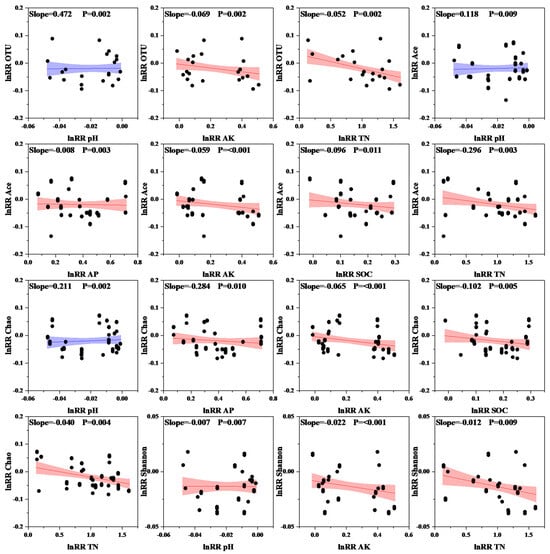 Relationship between soil microbial diversity and environmental factors; blue color indicates a positive correlation, and red color indicates a negative correlation. The shaded areas correspond to the 95% confidence interval. TN: total nitrogen; SOC: organic carbon; AP: available phosphorus; AK: available potassium.