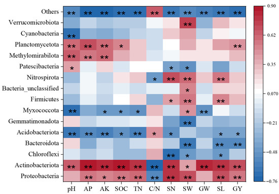 Correlation heatmap of bacterial abundance with soil nutrients and quinoa yield. TN (Total Nitrogen); SOC (Soil Organic Carbon); C/N (carbon-to-nitrogen ratio); pH (Acidity or Alkalinity); AP (Available Phosphorus); AK (Available Potassium); SN (number of spikes per plant); SW (1000-grain weight); GW (grain weight per plant); SL (main spike length); GY (Yield). * indicate significance at the 0.05 level, ** indicate significance at the 0.01 level.