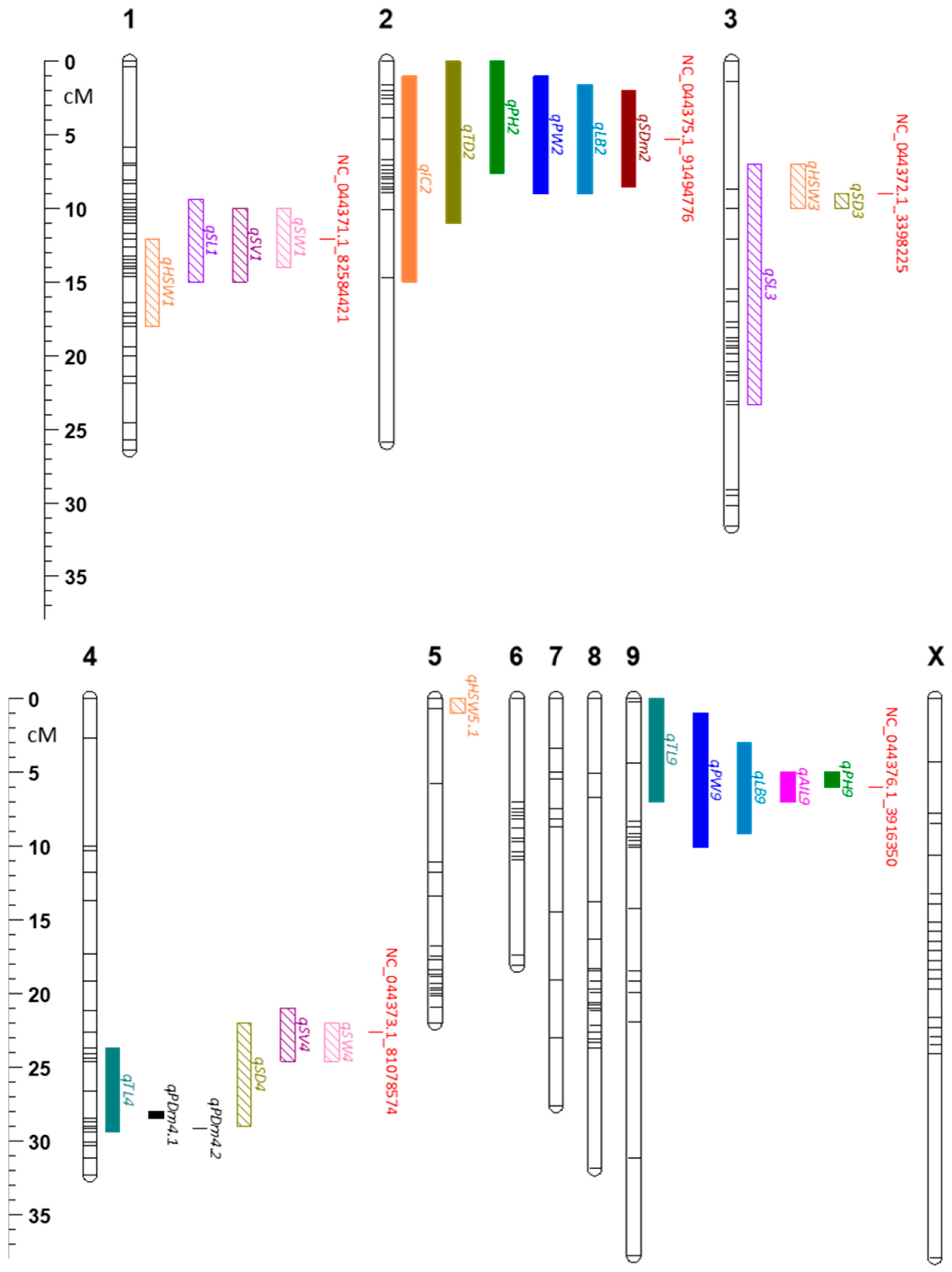 | Trunk Length | qTL9 | 9 | NC_044376.1_3916350 | 3.00 | 0.00–7.00 | 9.82 | 14.73 |