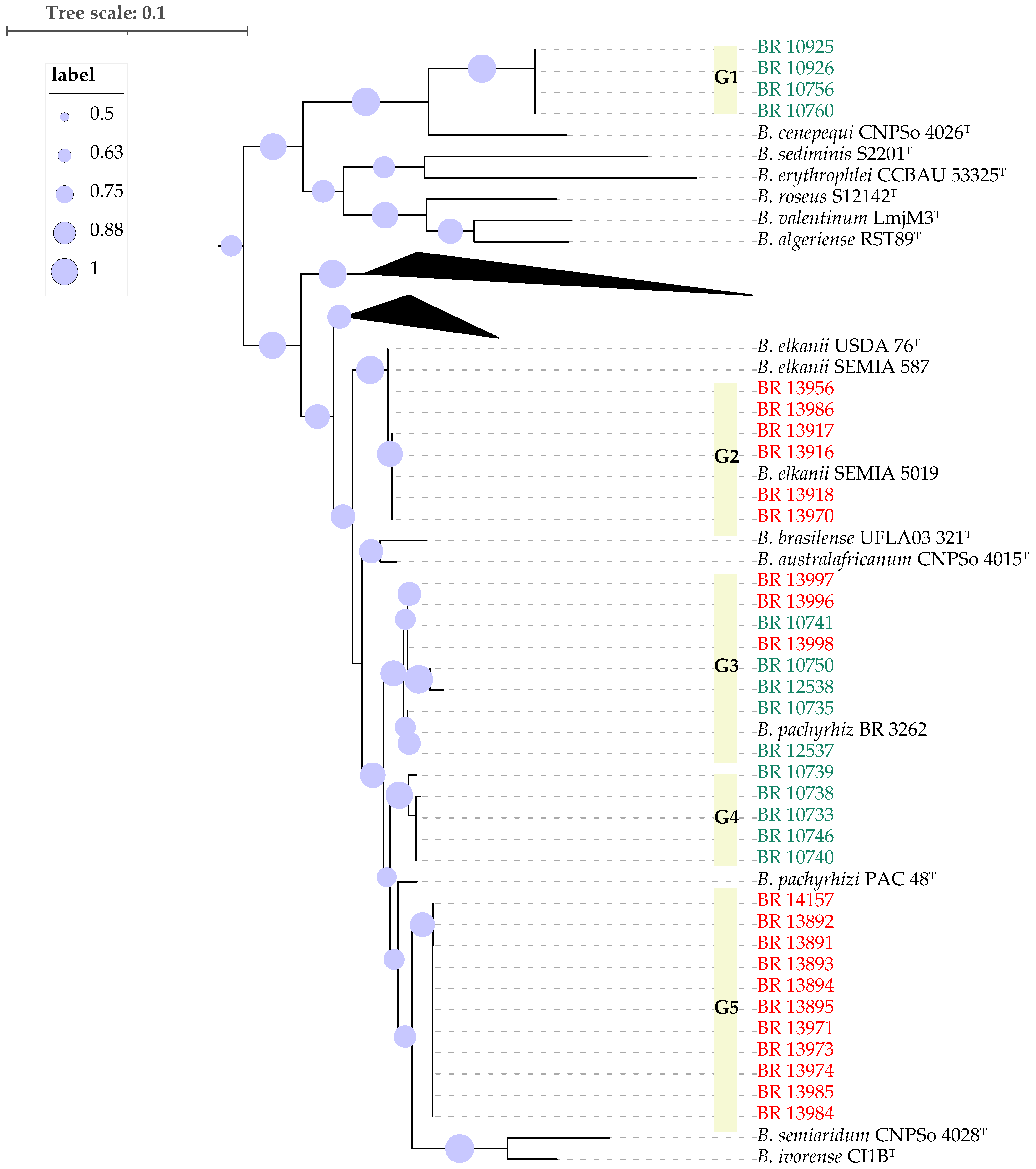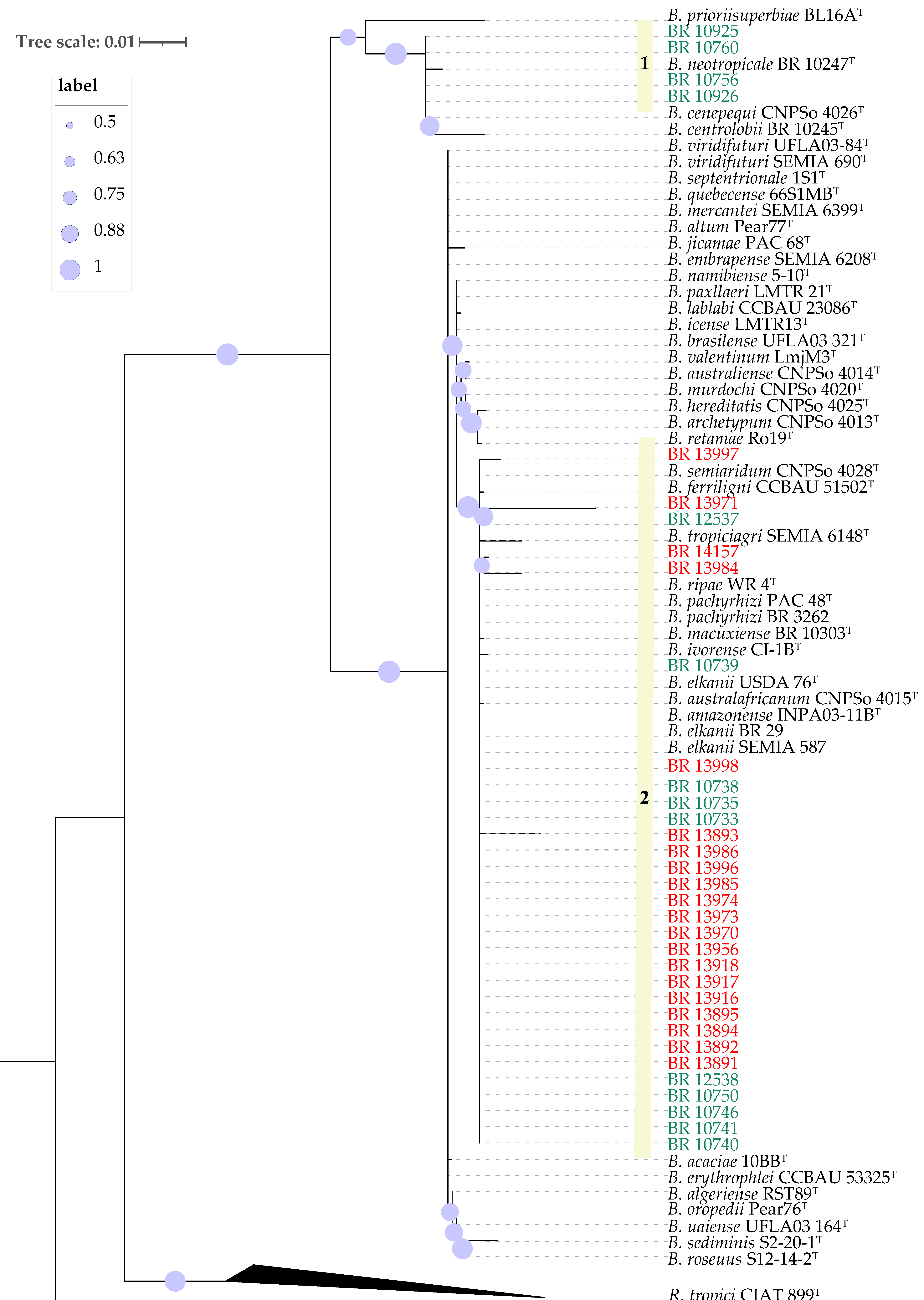 - Ormeño-Orrillo, E.; Martínez-Romero, E. A Genomotaxonomy View of the Bradyrhizobium Genus. Front. Microbiol. 2019, 10, 1334. [Google Scholar] [CrossRef] [PubMed]