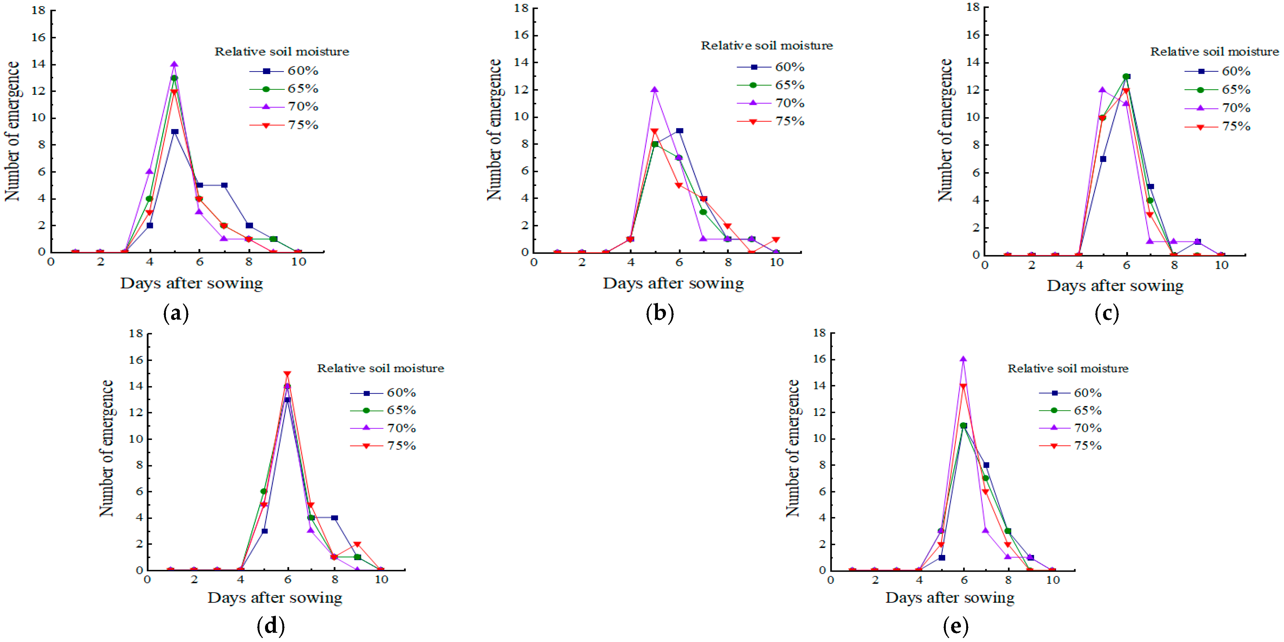 Daily seed emergence at different sowing depth (SD) levels: (a) SD 2.5 cm; (b) SD 4.0 cm; (c) SD 5.5 cm; (d) SD 7.0 cm; and (e) SD 8.5 cm.