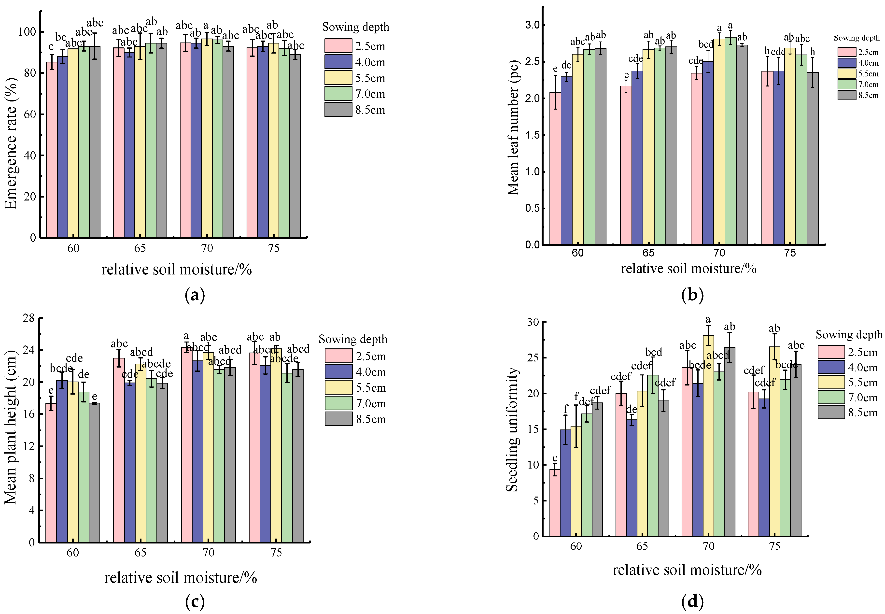 Calculation results of seedling growth indexes at different combinations of relative soil moisture (RSM) and sowing depth (SD): Calculation results of (a) emergence rate (ER), (b) mean leaf number (MLN), (c) mean plant height (MPH), and (d) uniformity (