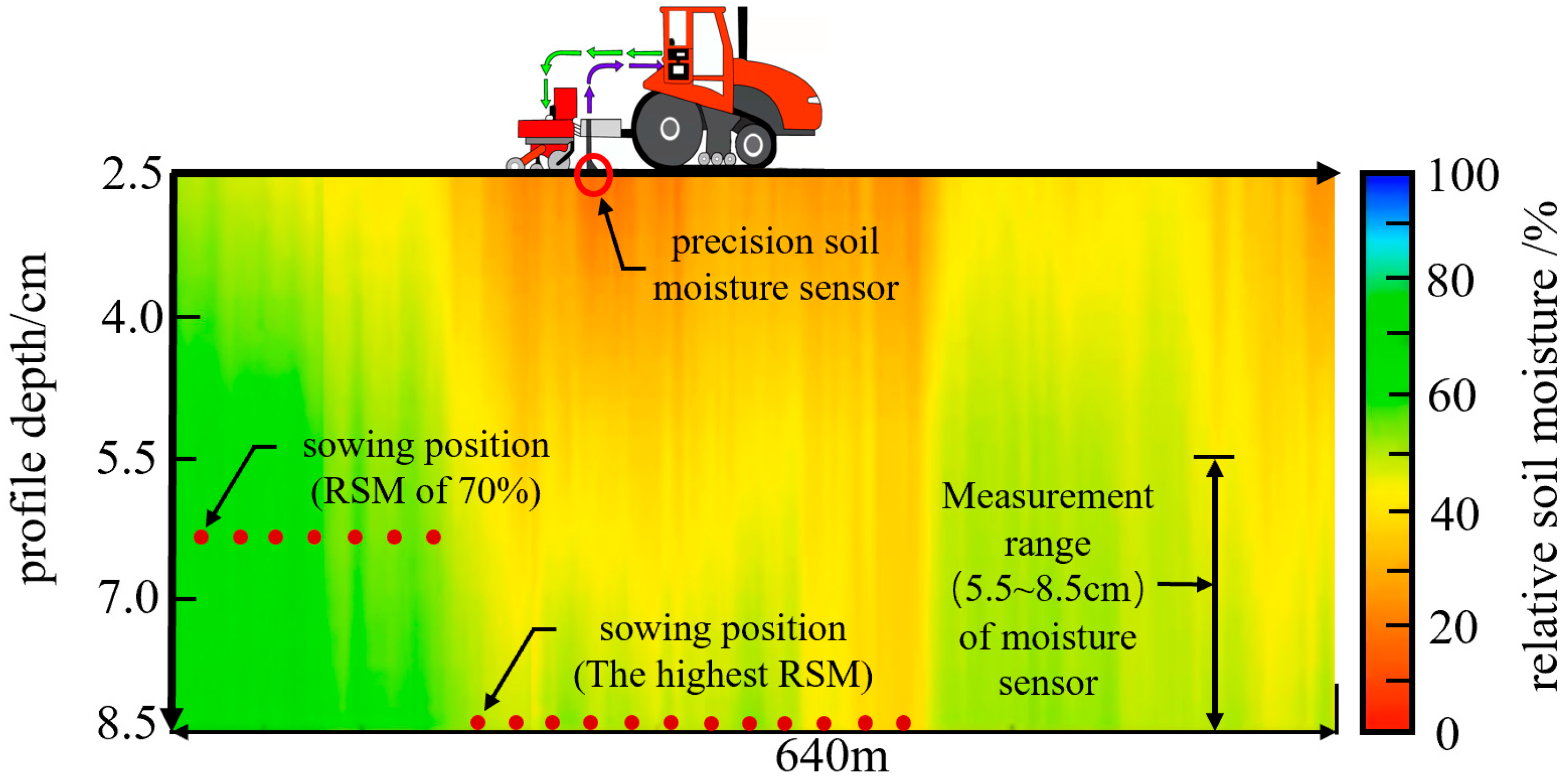 The seeding process with variable depth planting (VDP) method in the dryland. Abbreviations: RSM, relative soil moisture.