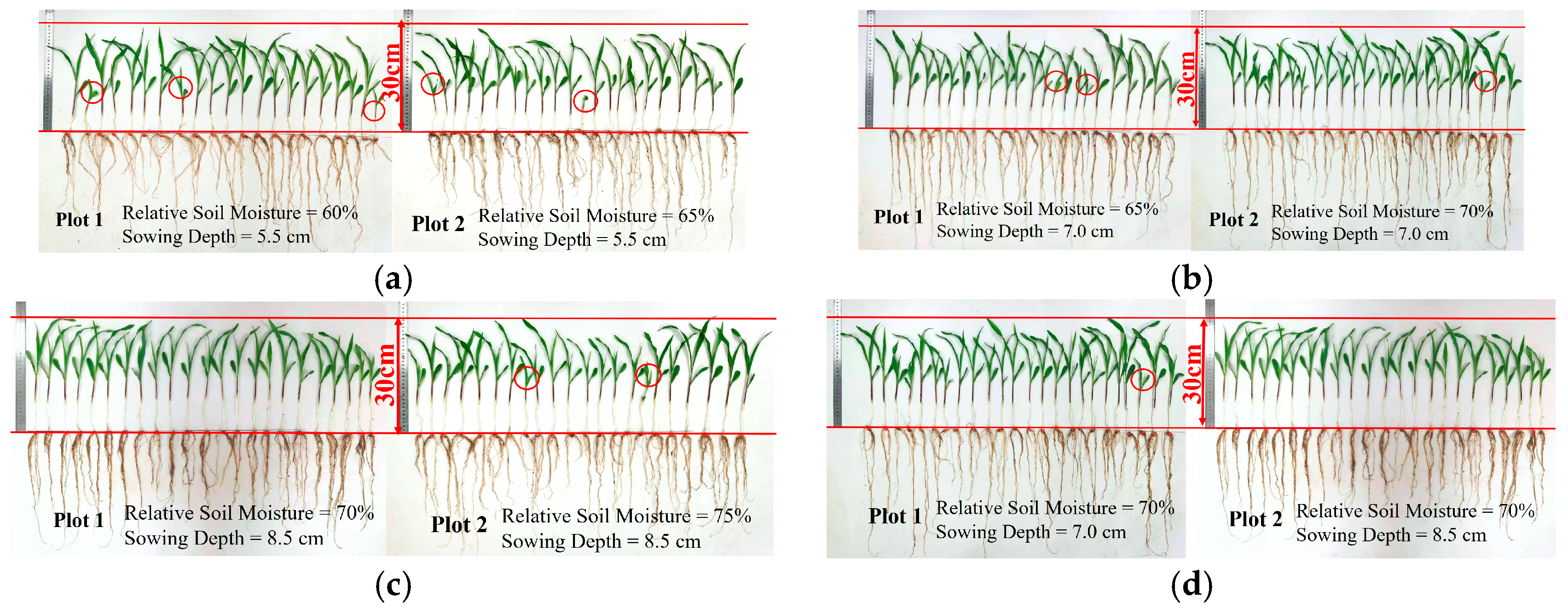 Maize growth under different validation treatments: (a) TCP-a; (b) TCP-b; (c) TCP-c; and (d) VDP-a.