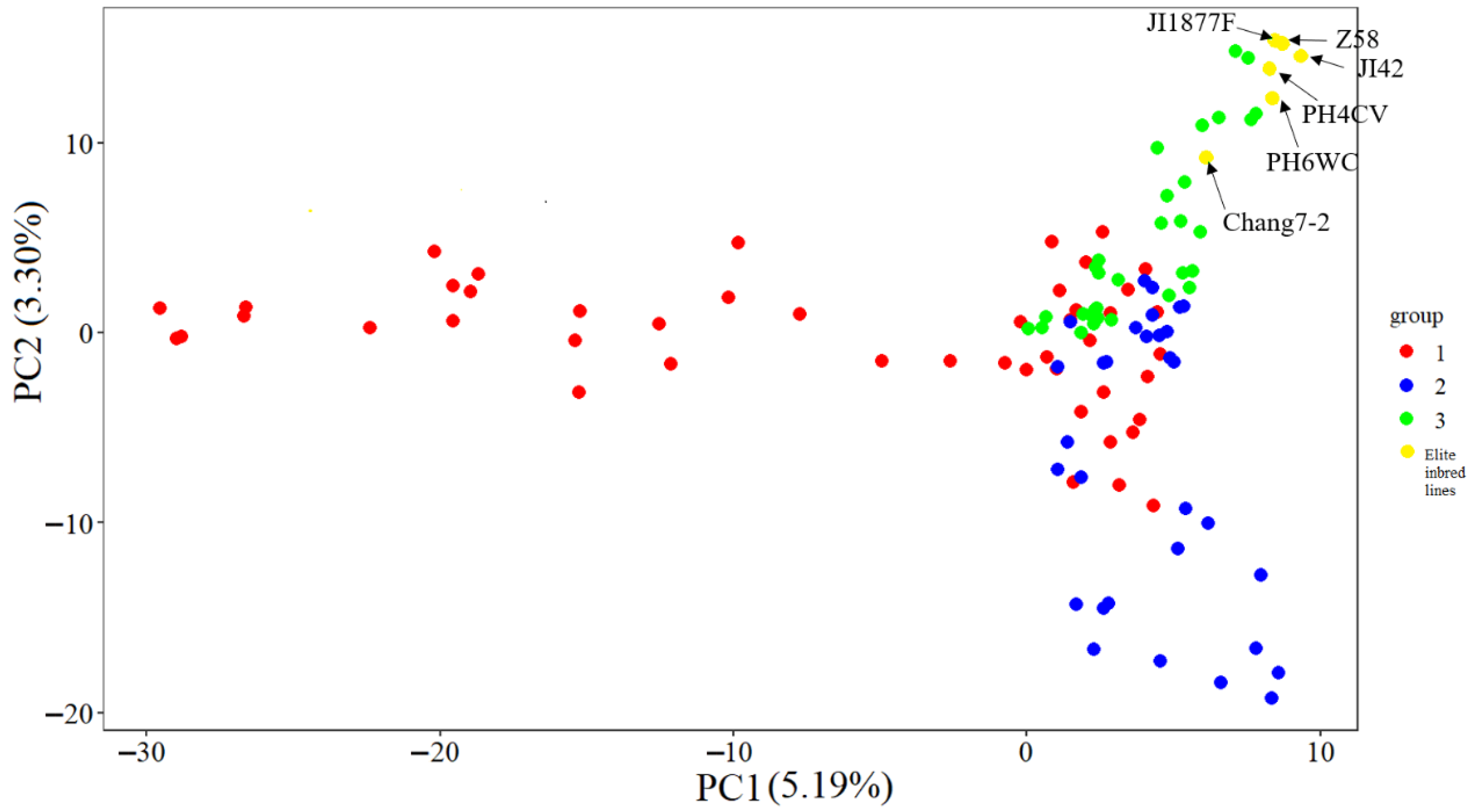3.1. Characterization of Genetic Diversity of Tropical Maize Germplasm and Its Breeding Value