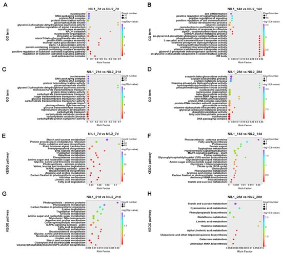 Functional enrichment analysis of DEGs during grain development between NIL1 and NIL2. (A–D) GO enrichment analysis of DEGs at 7 (A), 14 (B), 21 (C), and 28 (D) DPA. (E–H) KEGG pathway enrichment analysis of DEGs at 7 (E), 14 (F), 21 (G), and 28 (H) DPA.