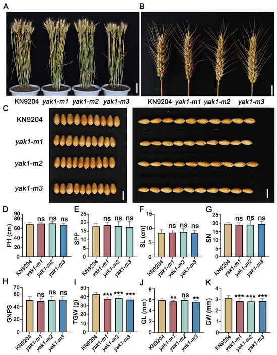 Phenotypic characterization of yak1 EMS mutants. (A) Representative field-grown plants of wild type (WT) and yak1 mutants at maturity. yak1-m1, yak1-m2, and yak1-m3 are independent allelic mutants. Scale bar, 10 cm. (B) Spikes morphology of WT and yak1 mutants. Scale bar, 2 cm. (C) Grain morphology comparison. Scale bar, 0.5 cm. (D–K) Quantitative analysis of agronomic traits: plant height (PH, (D)), spikes per plant (SPP, (E)), spike length (SL, (F)), spikelet number (SN, (G)), grain number per spike (GNPS, (H)), thousand-grain weight (TGW, (I)), grain length (GL, (J)), and grain width (GW, (K)). Data are presented as mean ± SD. Statistically significant differences are indicated by asterisks (**, p < 0.01; ***, p < 0.001, one-way ANOVA) or ns (not significant).