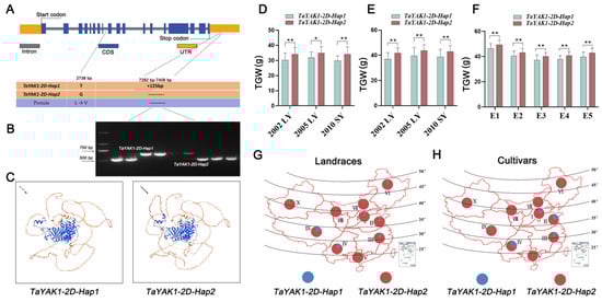 Haplotype analysis of TaYAK1-2D and its association with thousand-grain weight in wheat. (A) Gene structure of TaYAK1-2D, showing the SNP (2736 bp) and 125 bp InDel (7282–7406 bp) that define the two haplotypes Hap1 and Hap2. (B) Gel electrophoresis of the InDel marker distinguishing the two haplotypes. (C) Homology models comparing the three-dimensional protein structures of Hap1 and Hap2. (D,E) Association analysis of TaYAK1-2D haplotypes with TGW in 157 landraces of the Chinese mini-core collection (MCC) and 86 modern cultivars (MC) grown in three environments: 2002 LY (Luoyang), 2005 LY, and 2010 SY (Shunyi). (F) Association of TaYAK1-2D haplotypes with TGW in 132 wheat accessions from the Yellow and Huai River valley grown in five environments (E1–E5): E1 (2015LC, Luancheng), E2 (2016LC, Luancheng), E3 (2017LC, Luancheng), E4 (17AY, Anyang), and E5 (17BJ, Beijing). Data are presented as mean ± SD. Statistically significant differences are indicated by asterisks (*, p < 0.05; **, p < 0.01, one-way ANOVA). (G,H) Geographical distribution of TaYAK1-2D haplotypes in landraces (G) and modern cultivars (H) across ten major Chinese wheat zones: I, northern winter wheat region; II, Yellow and Huai River valley winter wheat region; III, low and middle Yangtze River valley winter wheat region; IV, southwestern winter wheat region; V, southern winter wheat region; VI, northeastern spring wheat region; VII, northern spring wheat region; VIII, northwestern spring wheat region; IX, Qinghai–Tibet spring–winter wheat region; and X, Xinjiang winter–spring wheat region.