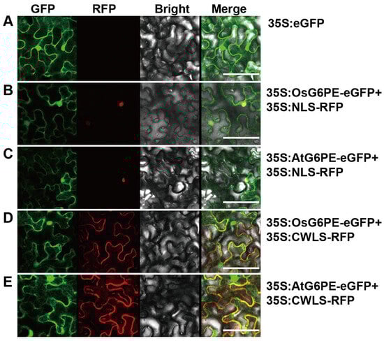 G6PE possesses broad substrate specificity and contributes to multiple physiological processes. To assess the subcellular localization of OsG6PE and AtG6PE, the fusion proteins were transiently co-expressed with marker proteins defining distinct organelles. The empty vector control showed only free eGFP (35S:eGFP) signals throughout the cytoplasm and nucleus (Figure 1A). Fluorescence microscopy revealed that both the 35S:OsG6PE and 35S:AtG6PE fusion proteins co-localized with the nuclear localization signal (NLS) marker (Figure 1B,C). Moreover, both fusion proteins co-localized with the cell membrane localization signal (CMLS) marker (Figure 1D,E). These results indicate that OsG6PE and AtG6PE are targeted to both subcellular compartments.