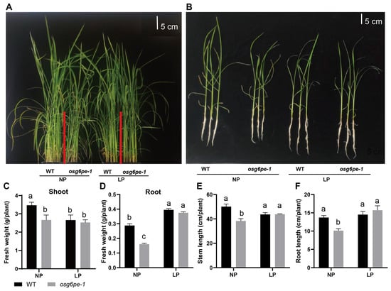 To evaluate the growth performance of osg6pe mutants, WT and mutant plants were hydroponically cultured under NP and LP conditions and monitored in situ. Under NP, WT plants exhibited greater overall vigor than osg6pe-1, as reflected by taller shoots and more robust aerial biomass (Figure 3A). By contrast, no significant differences in plant size were observed between WT and osg6pe-1 under LP. Similar trends were confirmed from harvested plants observed ex situ, which also revealed a shorter primary root system in osg6pe-1 compared with WT under NP, whereas no significant difference was detected under LP (Figure 3B). Consistent results were obtained for the independent rice allele osg6pe-2 (Supplementary Figure S1A,B) and for Arabidopsis atg6pe mutants (Supplementary Figure S2A).