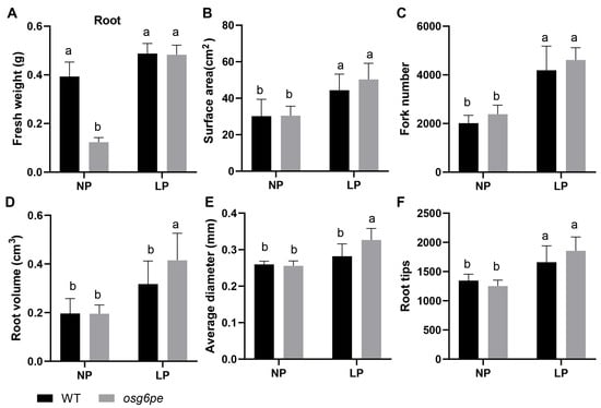Root system architecture parameters of WT and osg6pe mutants under different phosphate conditions. (A) Root fresh weight. (B–F) Quantitative analysis of root traits, including (B) surface area, (C) number of forks, (D) root volume, (E) average root diameter, and (F) number of root tips. Root traits were measured using WinRHIZO software (version 2016a, 32-bit; Regent Instruments Inc., Québec, Canada). Values represent means ± SD (n = 3). Different letters indicate significant differences among treatments (p < 0.05, Waller-Duncan test).