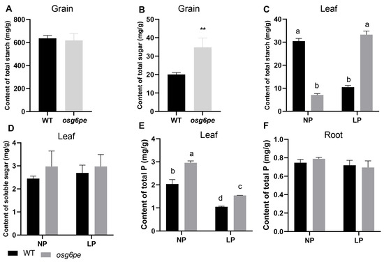 Measurement of starch and soluble sugar contents in rice. (A) Starch content in grains. (B) Soluble sugar content in grains. (C) Measurement of starch content in leaves under different phosphorus conditions. (D) Measurement of soluble sugar content in leaves under different phosphorus conditions. (E) Leaf phosphorus content. (F) Root phosphorus content. Values represent means ± SD (n = 3). Double asterisks (**) indicate significant differences between two groups (p < 0.01, Student’s t-test). Different letters indicate significant differences among treatments (p < 0.05, Waller-Duncan test).