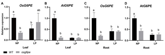 Expression levels of G6PE under different phosphorus concentrations. (A,B) Relative expression levels of OsG6PE and AtG6PE in leaf tissues under different phosphate conditions. (C,D) Relative expression levels of OsG6PE and AtG6PE in root tissues under NP and LP conditions. Values represent means ± SD (n = 3). Different letters indicate significant differences among treatments (p < 0.05, Waller-Duncan test).
