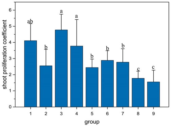 Effects of different combinations of 6-BA and KT concentrations on the proliferation coefficient of Q. palustris shoots. Different lowercase letters above the bars indicate the significant differences among treatments at the p < 0.05 level according to one-way ANOVA with Duncan’s multiple comparison test. The treatment numbers on the X-axis correspond to the following hormone combinations: a1 (0.3 mg/L 6-BA, 0 mg/L KT); a2 (0.3 mg/L 6-BA, 0.2 mg/L KT); a3 (0.3 mg/L 6-BA, 0.4 mg/L KT); a4 (0.6 mg/L 6-BA, 0 mg/L KT); a5 (0.6 mg/L 6-BA, 0.2 mg/L KT); a6 (0.6 mg/L 6-BA, 0.4 mg/L KT); a7 (0.9 mg/L 6-BA, 0 mg/L KT); a8 (0.9 mg/L 6-BA, 0.2 mg/L KT); a9 (0.9 mg/L 6-BA, 0.4 mg/L KT). Data are presented as mean ± standard deviation (n = 3).