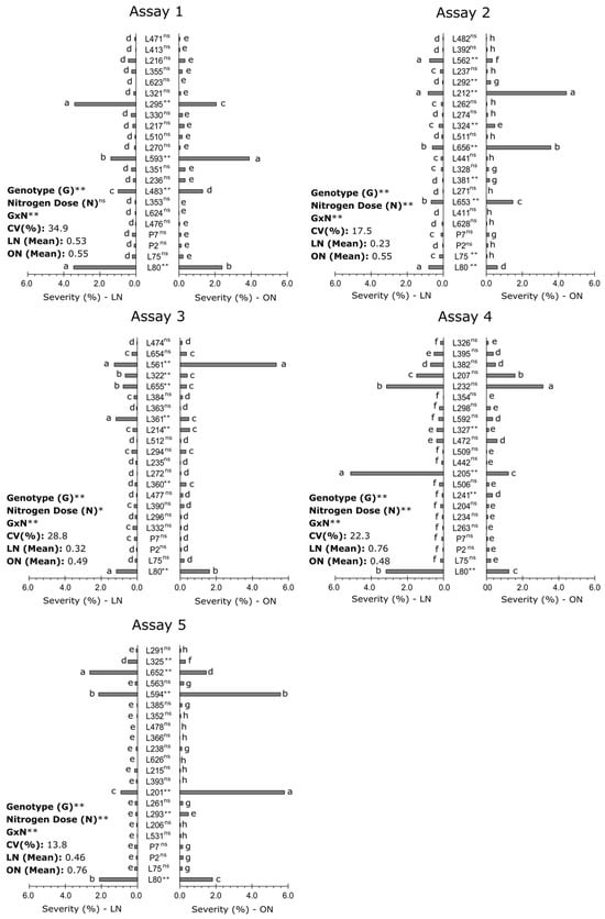 In Assay 5, the environment under a LN condition presented an approximately 40% lower mean severity compared to ON and a low CV (13.8%). In LN, the IL that presented the highest severity was L652, with the highest average, followed by L597 and L80. In the environment under ON, L201, which showed a moderate level of resistance in LN, showed a high level of susceptibility, superior to the other ILs. The severity of line L594 almost tripled in ON, and L652 showed a slightly lower severity than the susceptible L80.