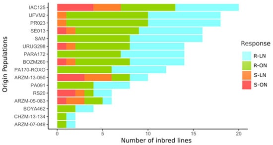 In a study carried out by Kurosawa et al. (2020) [], populations ARZM 07 049 and PARA 172 were considered resistant, and this work confirmed the presence of resistance alleles in both populations based on the ILs extracted from them. In a similar study carried out by Kurosawa et al. (2021) [], populations ARZM 05 083, BOZM 260, URUG 298, and IAC 125 were considered resistant to SCLB; however, the resistance that was broadly observed in the parent populations was not observed in the ILs (Figure 2).