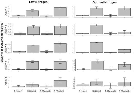The classification of resistant and susceptible inbred lines in each experiment and N level reinforces the role of selections based on the controls, with overlapping confidence intervals between groups with the same resistance classification in most cases. Examples that did not follow this pattern were Assay 5 in the LN condition and Assay 2 and 5 in the ON condition, in which there were overlapping confidence intervals between treatments and resistant checks and the susceptible IL L80 (Figure 3). In cases such as Assays 2, 3, and 4, in the ON condition, the groups of genotypes classified as susceptible presented significantly higher severity than the susceptible control L80, indicating high susceptibility in the optimal environment of N fertilization for these genotypes (Figure 3). Figure 4 shows the infection pattern of the control treatments, namely, the susceptible (L80) and resistant (P2, P7, and L75) controls, which served as reference for classifying the lines across experiments.