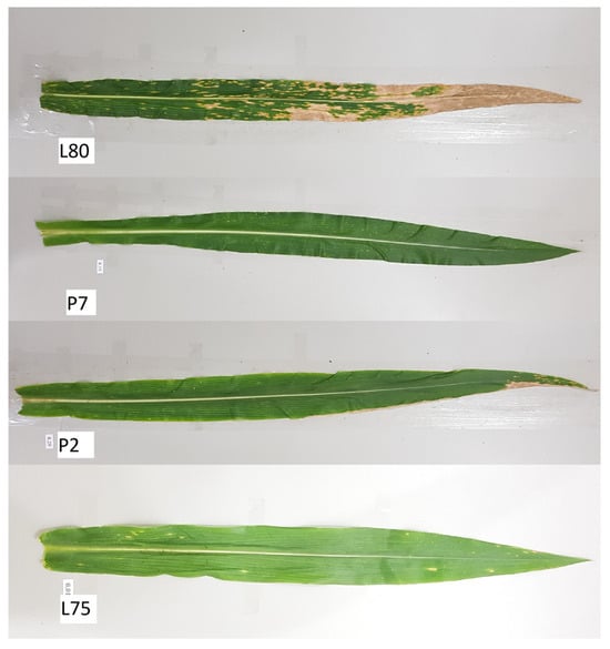 Detached leaves of the susceptible control (L80) and resistant controls (P7, P2, and L75) in response to Bipolaris maydis.