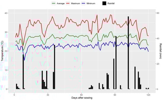 Precipitation (mm) and maximum, average, and minimum temperatures (°C) observed during the experimental period in the 2018–2019 crop year. Source: National Institute of Meteorology/Brazil (INMET).