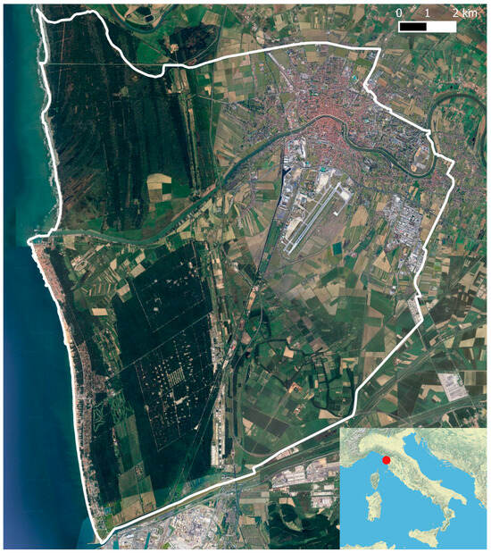 The municipality of Pisa lies in the lowest Arno plain (maximum elevation is 4 m a.s.l.) and occupies a surface of 185.3 km2. On the west, the municipality directly faces the Ligurian Sea, also including the estuary of the Arno River. In the north, the border between Pisa and its neighbor municipality, San Giuliano Terme, mainly follows the Arno River and the canal Fiume Morto, running from the Monte Pisano, near Caprona, down to the sea. In the south and the east, the boundaries with other municipalities (Cascina in the east, Collesalvetti and Livorno in the south) are less clear (Figure 1).