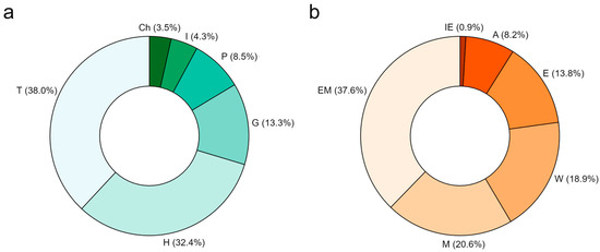 Biological (a) and chorological (b) spectra of the flora of the municipality of Pisa. (a) Biological spectrum: Ch, chamaephytes; H, hemicryptophytes; G, geophytes; I, hydrophytes; P, phanerophytes; T, therophytes. (b) Chorological spectrum: A, alien; E, Eurosiberian; EM, Eurosiberian-Mediterranean; IE, Italian endemics; M, Mediterranean; W, wide distribution.