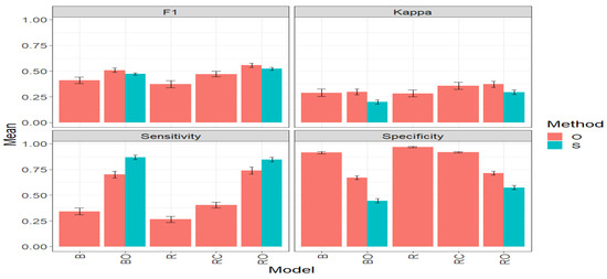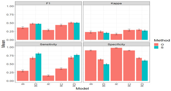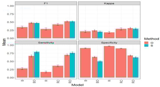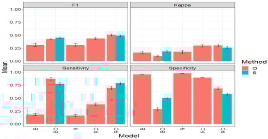 Under the F1 Score metric, concerning the “O” method, the best-performing model in terms of the average F1 score value was the RO model, with an average value of 0.5126. The second-best model was BO with an average value of 0.4813, representing a significant improvement of 32.30% compared to the B model, which had an average value of 0.3638 (See Figure 3 and Table A1). However, BO was outperformed by RO by 6.50%. The worst performance was observed in the R model, with an average value of 0.2895, representing a decrease of 39.84% compared to BO and 43.52% compared to RO. These results can be observed graphically in Figure 3.