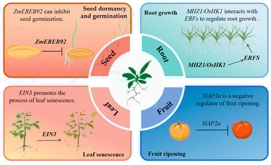 In addition to the above effects, ethylene signal transduction regulatory receptors play multiple roles in plant growth and development. Fruit ripening, root development, and seed germination are just a few of the activities that are greatly impacted by ethylene signal transduction in plants. These are some typical examples to illustrate the important role of ethylene signaling in plant growth and development (Figure 2). However, the actual situation is far more complex than this. Furthermore, we must emphasize that other aspects of ethylene’s involvement, such as the measurement of ethylene production and the application of inhibitors, are outside the scope of this review.