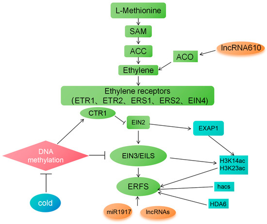 As the most common form of epigenetic modification, DNA methylation plays a vital regulatory role in most stages of plant growth and development [123]. It can regulate the role of ethylene by inhibiting or activating the expression of genes related to ethylene synthesis and signal transduction. The research has shown that environmental factors, such as stress conditions, can induce changes in DNA methylation status [124]. Hypermethylation in the promoter region of a specific gene may lead to a decrease in gene expression, thus affecting ethylene signal transduction. If the promoter region of a gene related to plant growth and development is methylated, the transcription factor responsible for initiating its expression cannot bind effectively, resulting in abnormal gene expression and affecting the plant’s growth and development process. According to relevant research, under low-temperature stress, different degrees of methylation changes occur in the promoter regions of multiple ethylene signal transduction-related genes in tomatoes. In the present results, the DNA methylation level of the CpG island of SlEIN3, SlERF-A1, and SlERT10 increased, and the DNA methylation level of the CpG island of SlCTR1 decreased in tomato fruit [32]. Meanwhile, the expression levels of SlEIN3, SlERF-A1, and SlERT10 decreased, while the expression level of SlCTR1 increased in tomato fruit stored at the low temperature. Moreover, it was observed that the ripening process of tomato fruits was significantly inhibited, indicating that low temperature inhibits ethylene signal transduction and delays the aging of tomato fruits via changing DNA methylation and gene expression. This further verifies the mechanism that DNA methylation regulates plant growth and development by affecting the expression of ethylene signal transduction-related genes. This regulatory mechanism provides an effective molecular mechanism for plants to finely regulate ethylene signal transduction to adapt to environmental changes in a complex environment.