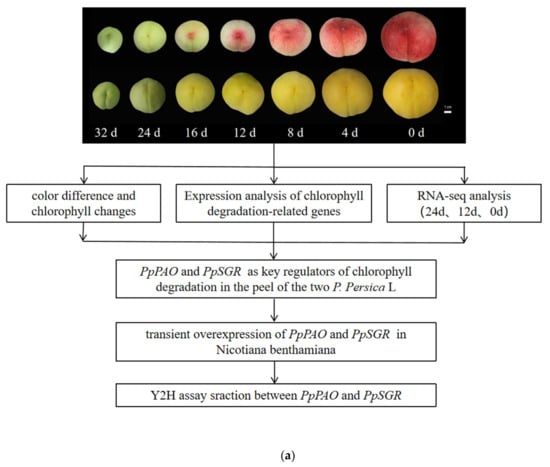 The appearance quality of P. persica L. serves a pivotal function in consumer selection and purchase decisions, with particular emphasis on the ground color of the fruit peel, which markedly influences initial consumer perceptions. The ground color is predominantly determined by the chlorophyll content. Degreening patterns in the peels of Zhongtao 14 and lines 20–29 were assessed, and KEGG enrichment analysis indicated the involvement of chlorophyll degradation genes within the purine metabolism pathway. qRT-PCR analysis revealed a notable upregulation in the expression of PpPAO and PpSGR from 8 to 0 days prior to maturation. Overexpression vectors for both PpPAO and PpSGR were developed, and transient transformation in N. benthamiana demonstrated that the overexpression of these genes induced considerable degreening in the leaves, with expression levels markedly higher than those in the control group. PpPAO and PpSGR were identified as potentially key regulators of the degreening process in the fruit peel of P. persica L. The Y2H assay further revealed an interaction between PpPAO and PpSGR.