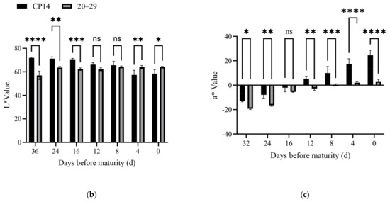 The alterations in the color phenotype observed in Zhongtao 14 and 20–29 prior to maturation are presented in Figure 1a. The peel of Zhongtao 14 underwent a gradual transition from green to red 12 days before maturity (DBM), followed by a pronounced intensification of its coloration. In contrast, the peel of lines 20–29 began exhibiting a light yellow hue at 16 and 12 DBM.