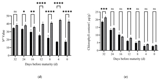 (a) Phenotypes of fruits at 32-0 DBM (bar = 1 cm) and the experimental workflow in this study; (b) Changes in peel color difference L* values of CP14 and 20–29 before fruit ripening; (c) Changes in peel color difference a* values of CP14 and 20–29 before fruit ripening; (d) Changes in peel color difference b* values of CP14 and 20–29 before fruit ripening; (e) Changes in chlorophyll content of CP14 and 20–29 before fruit ripening. Bars represent ± SD (n = 3). Asterisks indicate a significant difference between CP14 and 20–29 (* p < 0.05, ** p < 0.01, *** p < 0.001, and **** p < 0.0001 level); “ns” means not significant.