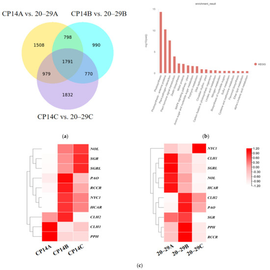 (a) Distribution of differential genes shown as a Venn diagram (CP14 vs. 20–29); (b) Enriched KEGG terms of CP14 vs. 20–29; (c) DEGs involved in chlorophyll degradation identified in the RNA-seq data of P. persica L. pericarp.