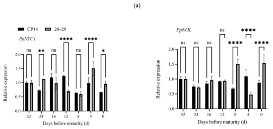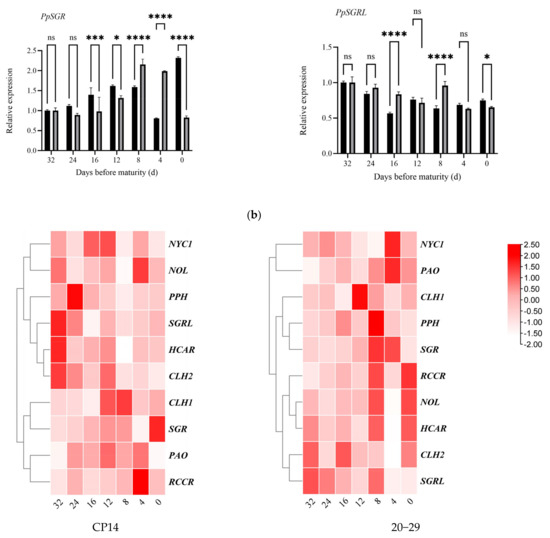(a) Expression of chlorophyll degradation genes; (b) Cluster analysis of chlorophyll degradation genes in different P. persica L. varieties. Bars represent ± SD (n = 3). Asterisks indicate a significant difference between CP14 and 20–29 (* p < 0.05, ** p < 0.01, *** p < 0.001, and **** p < 0.0001 level); ”ns” means not significant.