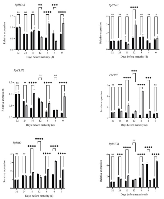 In summary, the qRT-PCR results demonstrated that the expression levels of PpPAO and PpSGR were markedly upregulated during 8–0 DBM. The cluster analysis indicated that PpSGR was clustered with PpCLH1, PpPAO, and PpRCCR in CP14. The correlation analysis revealed a significant negative correlation between PpPAO expression and chlorophyll content in CP14. Consequently, within the month preceding fruit maturation, chlorophyll degradation in the peel of P. persica L. was associated with PpPAO and PpSGR, with variations identified among different P. persica L. varieties. These findings preliminarily suggest that PpPAO and PpSGR serve as key regulators of chlorophyll degradation in the peel of the two P. persica L. varieties/lines prior to fruit maturation.
