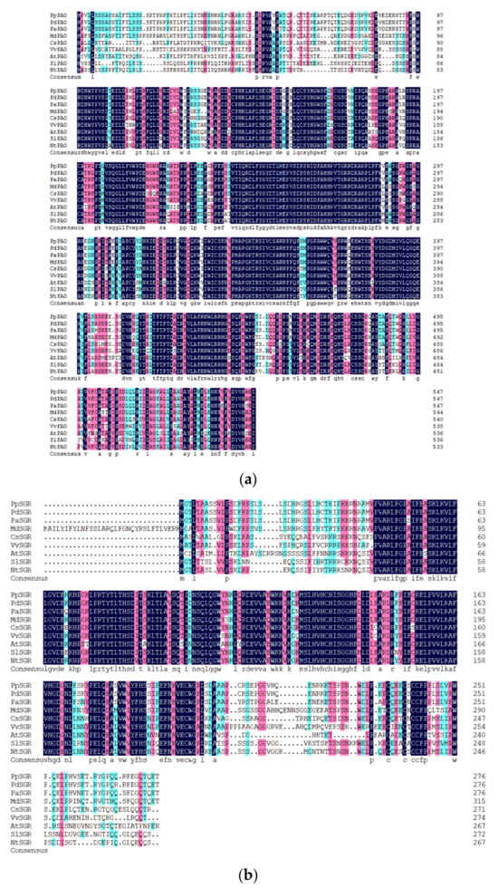 (a) Alignment of the amino acid sequences of PAO proteins from eight species. (b) Alignment of the amino acid sequences of SGR proteins from eight species. At, Arabidopsis thaliana; Nt, Nicotiana tabacum; Sl, Solanum lycopersicum; Vv, Vitis vinifera; Cs, Citrus sinensis; Md, Malus domestica; Pa, Prunus avium; Pd, Prunus dulcis; Pp, Prunus persica.