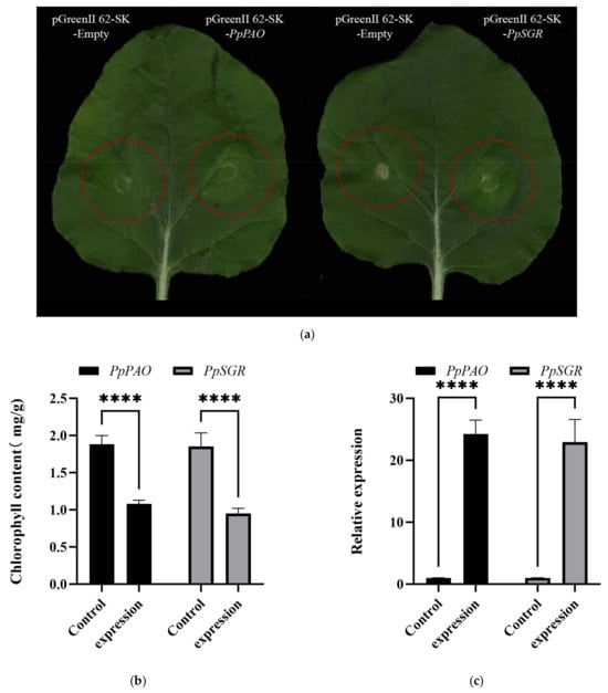 Under identical growth conditions, with the pGreenII 62-SK empty vector serving as a control, significant chlorophyll degradation was observed in N. benthamiana leaves infiltrated with PpPAO and PpSGR compared with the WT (Figure 5a).