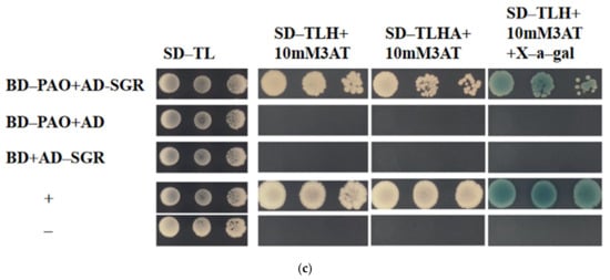 The experimental group containing the pGBKT7-PAO and pGADT7-SGR strains exhibited normal growth on SD-TL, SD-TLH + 10 mM 3AT, SD-TLHA + 10 mM 3AT, and SD-TLHA + 10 mM 3AT + X-α-gal deficient plates and displayed blue coloration on SD-TLHA + 10 mM 3AT + X-α-gal medium. In contrast, the control groups, consisting of pGBKT7-PAO and pGADT7, pGBKT7 and pGADT7-SGR, and the negative control pGADT7-largeT + pGBKT7-laminC strains, exhibited normal growth only on SD-TL plates but failed to grow on SD-TLH supplemented with 10 mM 3AT, SD-TLHA with 10 mM 3AT, and SD-TLHA with 10 mM 3AT and X-α-gal deficient plates (Figure 6c). These results suggest an interaction between pGBKT7-PAO and pGADT7-SGR.