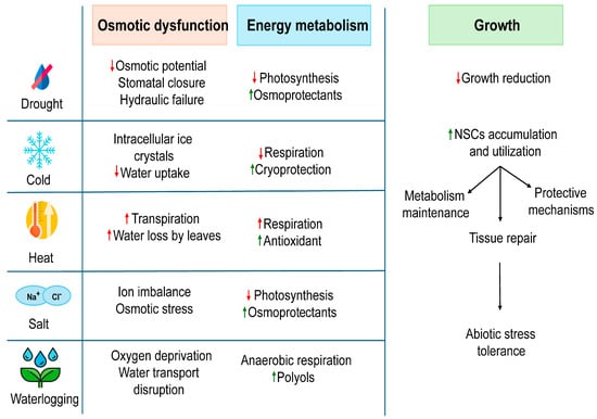 Climate change has intensified abiotic factors challenging in perennial plants’ and influencing their ability to endure such stress for long-term survival, which is partly governed by the carbon storage and allocation process [16]. Here, we explore the impact of abiotic stress on woody plants and examine the role of NSCs in mitigating these stresses (Figure 1).