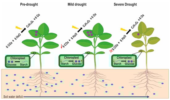 Variation in photosynthesis, starch, and glucose dynamics under different drought conditions. Pre-drought conditions show a normal photosynthesis rate with regular glucose concentration and starch accumulation. In mild drought conditions, the photosynthesis rate declines (downward red arrow), increasing starch degradation to maintain high glucose levels (upward red arrow) and lower the starch reserves (downward red arrow). Severe drought ceases photosynthesis (red cross), resulting in minimal glucose and starch levels (respective red arrows).