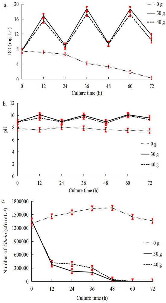 Dissolved oxygen (DO) (a), pH (b), and Vibrio number (c) with 0 g, 30 g, and 40 g U. pertusa in Experiment A with the addition of three Vibrio suspensions (107 cfu mL−1). The error bars (red) stand for the standard deviation, n = 3 (p < 0.05).